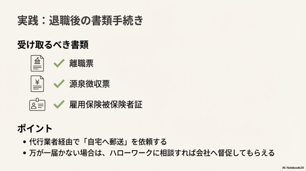 • 離職票:失業保険の申請に必要。転職先が決まっている場合は原則不要ですが、万が一早期退職した場合に備えて受け取っておくのが無難です。
