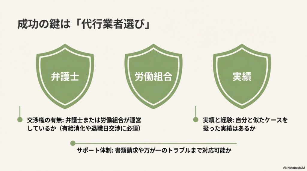 • 損害賠償対応の有無:万が一、会社側が強硬姿勢を見せた場合、弁護士であればそのまま代理人として対応可能です。リスクが高いと感じる場合は、最初から弁護士事務所が運営する代行サービスを選ぶのが最も安全です。