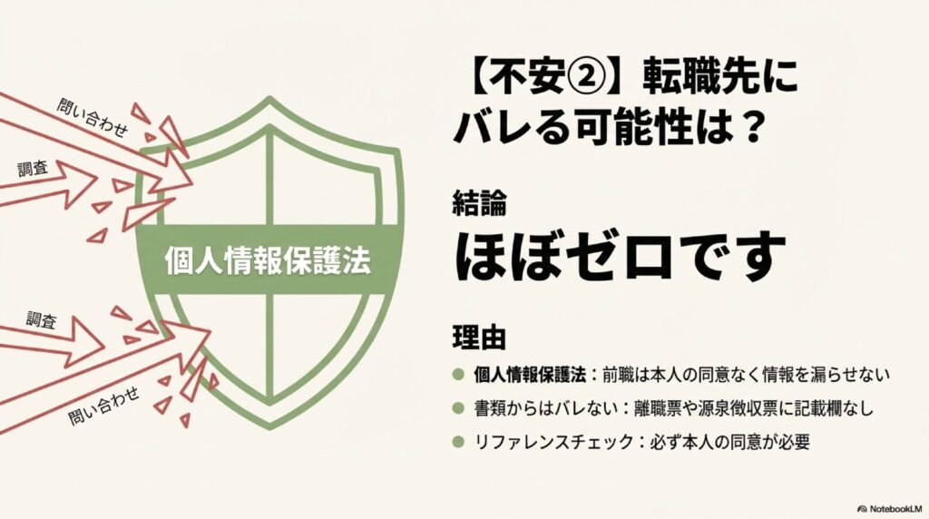 • 住民税の切り替え手続き:住民税を「特別徴収(給与天引き)」のまま転職先へ引き継ぐ場合、旧勤務先から新勤務先へ連絡が行くことがあります。この事務連絡の際に、担当者が余計な一言を添えてしまう可能性がわずかながら存在します。