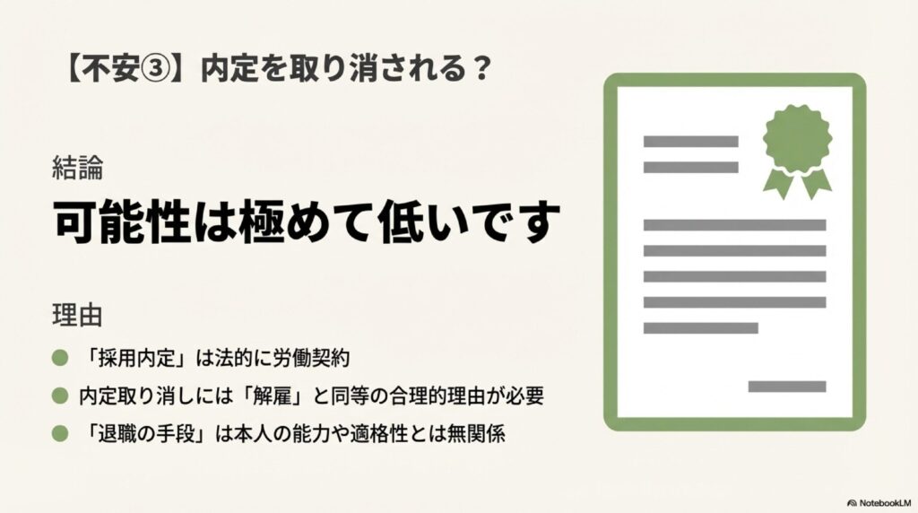 「もし退職代行を使ったことがバレたら、内定を取り消されるのではないか」という不安は、転職先が決まっている方にとって最大の懸念事項でしょう。しかし、法的な観点から冷静に分析すると、そのような事態が起こる可能性は極めて低いと言えます。